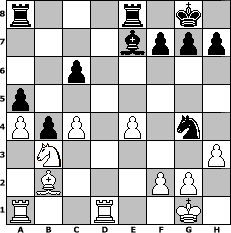 Partie-Notation im PGN-Format [Event "Mach mit und spiel ein Gambit"] [Site "www.mySchach.de"] [Date "2007.07.10"] [Round "1"] [White "muetoe"] [Black "schubi"] [ECO "A00"] [WhitemyELO "1678"] [BlackmyELO "1515"] [Result "1/2-1/2"] [TimeControl "10/1728000"] [WhiteDays "60"] [BlackDays "42"] [MySchachNr "36298"] 1. b4 e5 2. Bb2 Bxb4 3. Bxe5 Nf6 4. Nf3 Nc6 5. Bb2 O-O 6. a3 Be7 7. e3 d5 8. Be2 Qd6 9. O-O a6 10. d3 Bf5 11. Nbd2 b5 12. a4 b4 13. Nh4 Bd7 14. Nhf3 a5 15. Nb3 Rfe8 16. c3 Ne5 17. c4 Nxf3+ 18. Bxf3 c6 19. e4 dxe4 20. dxe4 Qxd1 21. Rfxd1 Bg4 22. Bxg4 Nxg4 23. h3 1/2-1/2 Stellungs-Notation im FEN-Format r3r1k1/4bppp/2p5/p7/PpP1P1n1/1N5P/1B3PP1/R2R2K1 - - - 0 23 Geschlagene Figuren Weiss: Geschlagene Figuren Schwarz: Klicken Sie auf eine geschlagene Figur um den gewünschten Zug darzustellen!