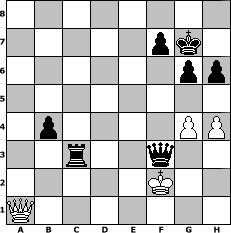 Partie-Notation im PGN-Format [Event "Krampusturnier 2"] [Site "www.mySchach.de"] [Date "2014.12.01"] [Round "1"] [White "faustballer"] [Black "Joschi"] [ECO "B10"] [WhitemyELO "1563"] [BlackmyELO "1579"] [Result "0-1"] [TimeControl "10/1728000"] [WhiteDays "20"] [BlackDays "20"] [MySchachNr "96985"] 1. e4 c6 2. g3 d5 3. Bg2 dxe4 4. Bxe4 Nf6 5. Bg2 Nbd7 6. Nf3 e6 7. O-O Be7 8. b3 O-O 9. Bb2 Rb8 10. d3 b6 11. Nbd2 Bb7 12. Rb1 c5 13. c4 Qc7 14. Re1 Rbd8 15. Bf1 Nb8 16. Be5 Qc8 17. Qc2 Nc6 18. Bc3 Rd7 19. a3 Rfd8 20. Ne4 Nxe4 21. dxe4 Qc7 22. Bg2 Bd6 23. e5 Be7 24. b4 cxb4 25. axb4 a5 26. b5 Nb4 27. Bxb4 Bxb4 28. Re2 g6 29. h4 Rc8 30. Nd2 Bxg2 31. Kxg2 Bxd2 32. Rxd2 Rxd2 33. Qxd2 Qxe5 34. Rc1 Qe4+ 35. f3 Qe5 36. Qd3 Qc5 37. g4 a4 38. Rc3 Ra8 39. Ra3 Qb4 40. Kh3 Rc8 41. Rc3 Ra8 42. Ra3 Rc8 43. Rc3 a3 44. Rxa3 Rxc4 45. Qe3 Qxb5 46. Qe1 Qc5 47. Qa1 e5 48. Rb3 b5 49. Rb1 b4 50. Re1 Rc3 51. Rf1 e4 52. Qa8+ Kg7 53. Qa1 exf3 54. Rxf3 h6 55. Kg2 Qc6 56. Kf2 Qxf3+ 0-1 Stellungs-Notation im FEN-Format 8/5pk1/6pp/8/1p4PP/2r2q2/5K2/Q7 - - - 0 57 Geschlagene Figuren Weiss: Geschlagene Figuren Schwarz: Klicken Sie auf eine geschlagene Figur um den gewünschten Zug darzustellen!
