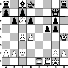 | Partie-Notation im PGN-Format [Event "Anf"] [Site "www.mySchach.de"] [Date "2005.07.02"] [Round "1"] [White "Look"] [Black "Gno"] [ECO "A20"] [WhitemyELO "1572"] [BlackmyELO "1410"] [Result "1-0"] [TimeControl "10/2592000"] [WhiteDays "84"] [BlackDays "90"] [MySchachNr "14756"] 1. c4 e5 2. e4 b6 3. Nf3 Bc5 4. d3 Nc6 5. Bg5 f6 6. Be3 Bxe3 7. fxe3 d6 8. d4 exd4 9. exd4 Qe7 10. Nc3 f5 11. Nd5 Qxe4+ 12. Be2 Kd8 13. Qd2 g6 14. O-O Nge7 15. Bd3 Qe6 16. Rae1 Qg8 17. Qg5 Qg7 18. Qh4 Bb7 19. Ng5 Bc8 20. Bc2 h6 21. Nxe7 hxg5 22. Nxc6+ 1-0 Stellungs-Notation im FEN-Format r1bk3r/p1p3q1/1pNp2p1/5pp1/2PP3Q/8/PPB3PP/4RRK1 - - - 0 22 Geschlagene Figuren Weiss:                              Geschlagene Figuren Schwarz:                               Klicken Sie auf eine geschlagene Figur um den gewünschten Zug darzustellen!