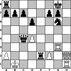 Partie-Notation im PGN-Format [Event "Entdeckung der Langsamkeit"] [Site "www.mySchach.de"] [Date "2009.08.15"] [Round "1"] [White "nogumo"] [Black "bane"] [ECO "A00"] [WhitemyELO "1681"] [BlackmyELO "1802"] [Result "0-1"] [TimeControl "10/3456000"] [WhiteDays "153"] [BlackDays "159"] [MySchachNr "58366"] 1. b4 e5 2. Bb2 Bxb4 3. Bxe5 Nf6 4. Nc3 O-O 5. Bxf6 Qxf6 6. Nd5 Qd4 7. Nxb4 Qxb4 8. e3 d6 9. Nf3 Nc6 10. c3 Qg4 11. h3 Qh5 12. Be2 Qg6 13. Qa4 Qxg2 14. Rg1 Qxh3 15. Ng5 Qh2 16. O-O-O Bf5 17. Bf3 h6 18. Be4 Qe5 19. Bxf5 Qxf5 20. Qh4 Ne5 21. e4 Qf6 22. d4 Ng6 23. Qh2 hxg5 24. Rg4 Qf3 25. Rh1 Qxc3+ 26. Kb1 Qd3+ 27. Kc1 Rfe8 28. Rxg5 Rxe4 29. Rg3 Qc4+ 30. Kb1 Re2 0-1 Stellungs-Notation im FEN-Format r5k1/ppp2pp1/3p2n1/8/2qP4/6R1/P3rP1Q/1K5R - - - 4 31 Geschlagene Figuren Weiss: Geschlagene Figuren Schwarz: Klicken Sie auf eine geschlagene Figur um den gewünschten Zug darzustellen!