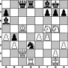 Partie-Notation im PGN-Format [Event "Oktober Gold"] [Site "www.mySchach.de"] [Date "2025.10.11"] [Round "1"] [White "alibengali"] [Black "jeremyt"] [ECO "B07"] [WhitemyELO "1715"] [BlackmyELO "2120"] [Result "0-1"] [TimeControl "10/1728000"] [WhiteDays "37"] [BlackDays "41"] [MySchachNr "133709"] 1. e4 d6 2. d4 Nf6 3. Nc3 e5 4. Bc4 Nbd7 5. Nf3 Be7 6. O-O O-O 7. dxe5 dxe5 8. h3 c6 9. b3 b5 10. Bd3 Qc7 11. Bb2 Nc5 12. a4 b4 13. Ne2 Nfd7 14. Ng3 Nxd3 15. cxd3 Rd8 16. Nf5 Bf8 17. Rc1 Ba6 18. Qc2 Rac8 19. Rfd1 c5 20. d4 exd4 21. Bxd4 Qf4 22. Be3 Qb8 23. Ng5 Ne5 24. Rxd8 Rxd8 25. f4 Nd3 26. Rd1 Qb7 27. Bxc5 Qc8 0-1 Stellungs-Notation im FEN-Format 2qr1bk1/p4ppp/b7/2B2NN1/Pp2PP2/1P1n3P/2Q3P1/3R2K1 - - - 1 28 Geschlagene Figuren Weiss: Geschlagene Figuren Schwarz: Klicken Sie auf eine geschlagene Figur um den gewünschten Zug darzustellen!