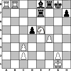 Partie-Notation im PGN-Format [Event "Sommerlaune"] [Site "www.mySchach.de"] [Date "2009.07.15"] [Round "1"] [White "Helmut48"] [Black "RashimIbenRohal"] [ECO "C16"] [WhitemyELO "1833"] [BlackmyELO "1515"] [Result "1-0"] [TimeControl "10/2592000"] [WhiteDays "120"] [BlackDays "090"] [MySchachNr "57517"] 1. e4 e6 2. d4 d5 3. Nc3 Bb4 4. e5 Ne7 5. a3 Bxc3+ 6. bxc3 c5 7. Qg4 O-O 8. Bd3 f5 9. exf6 Rxf6 10. Bg5 Rf7 11. Qh4 g6 12. Nf3 Nbc6 13. O-O c4 14. Be2 Qa5 15. Bxe7 Nxe7 16. Ne5 Rg7 17. Qh3 Nf5 18. Rfb1 Qd8 19. Bg4 Qf6 20. Qf3 b6 21. Nxc4 Ba6 22. Ne5 Rf8 23. a4 Qg5 24. a5 Nxd4 25. Qg3 Ne2+ 26. Bxe2 Qxg3 27. hxg3 Bxe2 28. axb6 axb6 29. Rxb6 Rc7 30. Rxe6 Bb5 31. Rb6 Be8 32. Ra8 Re7 33. f4 g5 34. Rbb8 gxf4 35. gxf4 1-0 Stellungs-Notation im FEN-Format RR2brk1/4r2p/8/3pN3/5P2/2P5/2P3P1/6K1 - - - 0 35 Geschlagene Figuren Weiss: Geschlagene Figuren Schwarz: Klicken Sie auf eine geschlagene Figur um den gewünschten Zug darzustellen!