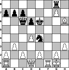 Partie-Notation im PGN-Format [Event "Herbstturnier 2022"] [Site "www.mySchach.de"] [Date "2022.09.26"] [Round "1"] [White "Rotstift10"] [Black "Mynona"] [ECO "C64"] [WhitemyELO "1638"] [BlackmyELO "1445"] [Result "1-0"] [TimeControl "10/1728000"] [WhiteDays "57"] [BlackDays "60"] [MySchachNr "127260"] 1. e4 e5 2. Nf3 Nc6 3. Bb5 Bc5 4. O-O d6 5. h3 Bd7 6. Nc3 Nd4 7. Bxd7+ Qxd7 8. d3 f5 9. exf5 Nf6 10. Ne4 h6 11. Nxc5 Qc6 12. Nxd4 Qxc5 13. Ne6 Qb6 14. Nxg7+ Kf7 15. Ne6 Rag8 16. b3 Qc6 17. f3 Rg6 18. fxg6+ Kxe6 19. d4 e4 20. fxe4 Nxe4 21. g7 Rg8 22. Bxh6 1-0 Stellungs-Notation im FEN-Format 6r1/ppp3P1/2qpk2B/8/3Pn3/1P5P/P1P1P1P1/R2Q1RK1 - - - 0 22 Geschlagene Figuren Weiss: Geschlagene Figuren Schwarz: Klicken Sie auf eine geschlagene Figur um den gewünschten Zug darzustellen!