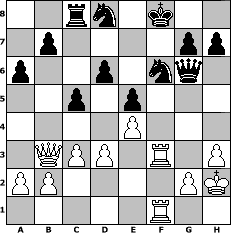 Partie-Notation im PGN-Format [Event "Die letzten Sommertage!!! Teil2"] [Site "www.mySchach.de"] [Date "2009.09.14"] [Round "1"] [White "Andylein1989"] [Black "HenrySchinasky"] [ECO "B02"] [WhitemyELO "1537"] [BlackmyELO "2106"] [Result "0-1"] [TimeControl "10/864000"] [WhiteDays "00"] [BlackDays "23"] [MySchachNr "59016"] 1. e4 Nf6 2. Nc3 e5 3. Bc4 Bc5 4. Nf3 d6 5. d3 O-O 6. O-O a6 7. h3 Be6 8. Bxe6 fxe6 9. Be3 Bxe3 10. fxe3 c5 11. Ng5 Qd7 12. Ne2 Nc6 13. Ng3 Qe8 14. c3 Qg6 15. Nxe6 Qxg3 16. Nxf8 Qxe3+ 17. Kh1 Kxf8 18. Rf3 Qg5 19. Qb3 Nd8 20. Raf1 Rc8 21. Kh2 Qg6 0-1 Stellungs-Notation im FEN-Format 2rn1k2/1p4pp/p2p1nq1/2p1p3/4P3/1QPP1R1P/PP4PK/5R2 - - - 8 22 Geschlagene Figuren Weiss: Geschlagene Figuren Schwarz: Klicken Sie auf eine geschlagene Figur um den gewünschten Zug darzustellen!