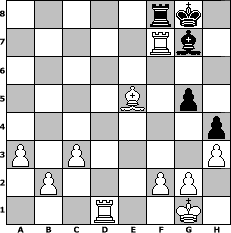 Partie-Notation im PGN-Format [Event "1. Weltmeisterschaft @ myschach.de"] [Site "www.mySchach.de"] [Date "2006.09.15"] [Round "2"] [White "HPB2005"] [Black "tschulz"] [ECO "B06"] [WhitemyELO "1988"] [BlackmyELO "1593"] [Result "1-0"] [TimeControl "10/2592000"] [WhiteDays "72"] [BlackDays "55"] [MySchachNr "28512"] 1. e4 g6 2. Nf3 Bg7 3. d4 c6 4. Nc3 d5 5. h3 Nh6 6. Bd3 O-O 7. O-O b5 8. Bf4 b4 9. Ne2 a5 10. a3 Na6 11. Qd2 dxe4 12. Bxe4 Nf5 13. Bxc6 Ra7 14. Ne5 Bb7 15. Bxb7 Rxb7 16. Rfe1 b3 17. c3 a4 18. Rad1 Rb6 19. Ng3 Nxg3 20. Bxg3 Nc7 21. d5 e6 22. Nxf7 Rxf7 23. dxe6 Nxe6 24. Qxd8+ Nxd8 25. Rxd8+ Rf8 26. Rdd1 Rc6 27. Rd7 Rcf6 28. Ra7 Bh6 29. Rxa4 Bd2 30. Rd1 Bh6 31. Rh4 Bg7 32. Rb4 h5 33. Rxb3 g5 34. Rb7 h4 35. Be5 R6f7 36. Rxf7 1-0 Stellungs-Notation im FEN-Format 5rk1/5Rb1/8/4B1p1/7p/P1P4P/1P3PP1/3R2K1 - - - 0 36 Geschlagene Figuren Weiss: ![]() ![]() ![]() ![]() ![]() ![]() ![]() ![]() ![]() ![]() ![]() ![]() ![]() ![]() ![]() Geschlagene Figuren Schwarz: ![]() ![]() ![]() ![]() ![]() ![]() ![]() ![]() ![]() ![]() ![]() ![]() ![]() ![]() ![]() Klicken Sie auf eine geschlagene Figur um den gewünschten Zug darzustellen!