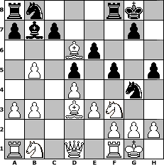 Partie-Notation im PGN-Format [Event "1.Schaltjahresturnier@mySchach"] [Site "www.mySchach.de"] [Date "2004.02.29"] [Round "2"] [White "HPB2005"] [Black "Bitworm"] [ECO "A01"] [WhitemyELO "1625"] [BlackmyELO "1387"] [Result "1-0"] [TimeControl "10/1728000"] [WhiteDays "39"] [BlackDays "00"] [MySchachNr "2652"] 1. b3 e6 2. Bb2 Nf6 3. e3 Bc5 4. d4 Bb4+ 5. c3 O-O 6. cxb4 d5 7. Bd3 Nc6 8. a3 b5 9. Bxb5 Qd6 10. Nf3 Nb8 11. Bd3 Ba6 12. b5 Bb7 13. O-O Ng4 14. Bc3 f5 15. Bb4 h5 16. Bxd6 1-0 Stellungs-Notation im FEN-Format rn3rk1/pbp3p1/3Bp3/1P1p1p1p/3P2n1/PP1BPN2/5PPP/RN1Q1RK1 - - - 0 16 Geschlagene Figuren Weiss: ![]() ![]() ![]() ![]() ![]() ![]() ![]() ![]() ![]() ![]() ![]() ![]() ![]() ![]() ![]() Geschlagene Figuren Schwarz: ![]() ![]() ![]() ![]() ![]() ![]() ![]() ![]() ![]() ![]() ![]() ![]() ![]() ![]() ![]() Klicken Sie auf eine geschlagene Figur um den gewünschten Zug darzustellen!