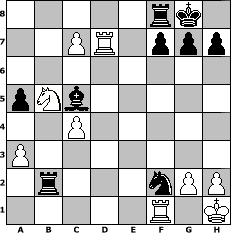 Partie-Notation im PGN-Format [Event "Es gibt nur einen Gott BelaFarinRod Teil2"] [Site "www.mySchach.de"] [Date "2005.04.27"] [Round "2"] [White "tschulz"] [Black "Knight"] [ECO "A00"] [WhitemyELO "1511"] [BlackmyELO "1407"] [Result "1/2-1/2"] [TimeControl "10/864000"] [WhiteDays "07"] [BlackDays "10"] [MySchachNr "12561"] 1. b4 e5 2. Bb2 Qe7 3. a3 Nf6 4. e3 d5 5. b5 d4 6. Bc4 Qc5 7. exd4 exd4 8. Qe2+ Be7 9. Nf3 Bg4 10. d3 O-O 11. O-O Nbd7 12. c3 dxc3 13. Nxc3 Bxf3 14. Qxf3 Ne5 15. Qxb7 Nxc4 16. dxc4 Rab8 17. Qc6 Qxc6 18. bxc6 Rxb2 19. Nb5 a5 20. Nxc7 Bd6 21. Nb5 Bc5 22. Rad1 Ne4 23. Rd7 Nxf2 24. c7 Nd3+ 25. Kh1 Nf2+ 26. Kg1 Nh3+ 27. Kh1 Nf2+ 28. Kg1 Nh3+ 29. Kh1 Nf2+ 1/2-1/2 Stellungs-Notation im FEN-Format 5rk1/2PR1ppp/8/pNb5/2P5/P7/1r3nPP/5R1K - - - 11 30 Geschlagene Figuren Weiss: ![]() ![]() ![]() ![]() ![]() ![]() ![]() ![]() ![]() ![]() ![]() ![]() ![]() ![]() ![]() Geschlagene Figuren Schwarz: ![]() ![]() ![]() ![]() ![]() ![]() ![]() ![]() ![]() ![]() ![]() ![]() ![]() ![]() ![]() Klicken Sie auf eine geschlagene Figur um den gewünschten Zug darzustellen!