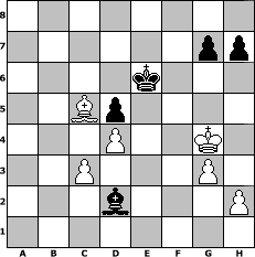 Partie-Notation im PGN-Format [Event "reisinger"] [Site "www.mySchach.de"] [Date "2010.08.09"] [Round "1"] [White "Joschi"] [Black "espero"] [ECO "A92"] [WhitemyELO "1568"] [BlackmyELO "1624"] [Result "1/2-1/2"] [TimeControl "10/1728000"] [WhiteDays "19"] [BlackDays "20"] [MySchachNr "67547"] 1. d4 f5 2. c4 Nf6 3. g3 e6 4. Bg2 Be7 5. Nf3 O-O 6. O-O Ne4 7. Nc3 d5 8. cxd5 exd5 9. Ne5 c6 10. f3 Nxc3 11. bxc3 Nd7 12. Nxd7 Bxd7 13. e4 fxe4 14. fxe4 Rxf1+ 15. Qxf1 dxe4 16. Bxe4 Qa5 17. Qc4+ Kh8 18. Bf4 Bh3 19. Be5 Rf8 20. Bg2 Bxg2 21. Kxg2 Qd5+ 22. Qxd5 cxd5 23. Rb1 b6 24. Rb5 Rd8 25. a4 Kg8 26. a5 bxa5 27. Rxa5 Rd7 28. Bb8 Bg5 29. Rxa7 Rxa7 30. Bxa7 Bd2 31. Kf3 Kf7 32. Kg4 Ke6 33. Bc5 1/2-1/2 Stellungs-Notation im FEN-Format 8/6pp/4k3/2Bp4/3P2K1/2P3P1/3b3P/8 - - - 6 33 Geschlagene Figuren Weiss: Geschlagene Figuren Schwarz: Klicken Sie auf eine geschlagene Figur um den gewünschten Zug darzustellen!