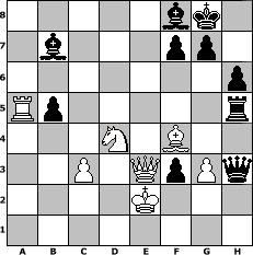 Partie-Notation im PGN-Format [Event "Wer Spanisch spielen kann, kann Schach spielen!"] [Site "www.mySchach.de"] [Date "2009.12.04"] [Round "1"] [White "Meister64"] [Black "Zoidberg"] [ECO "C78"] [WhitemyELO "1778"] [BlackmyELO "1818"] [Result "0-1"] [TimeControl "10/864000"] [WhiteDays "39"] [BlackDays "35"] [MySchachNr "61222"] 1. e4 e5 2. Nf3 Nc6 3. Bb5 a6 4. Ba4 Nf6 5. O-O b5 6. Bb3 Be7 7. c3 d6 8. h3 O-O 9. d4 Bb7 10. Re1 Re8 11. a4 h6 12. Bc2 Bf8 13. d5 Ne7 14. b4 Ng6 15. Qe2 c6 16. dxc6 Bxc6 17. Nbd2 Nf4 18. Qe3 d5 19. Nxe5 Nxh3+ 20. Qxh3 Rxe5 21. Nf3 Rh5 22. Qg3 Nxe4 23. Bxe4 dxe4 24. Nd4 Bd5 25. Bf4 bxa4 26. Rxa4 Qf6 27. b5 axb5 28. Rxa8 Bxa8 29. Ra1 Bb7 30. Ra5 Ba6 31. Qe3 Qh4 32. Kf1 Bb7 33. g3 Qg4 34. f3 Qh3+ 35. Ke2 exf3+ 0-1 Stellungs-Notation im FEN-Format 5bk1/1b3pp1/7p/Rp5r/3N1B2/2P1QpPq/4K3/8 - - - 0 36 Geschlagene Figuren Weiss: ![]() ![]() ![]() ![]() ![]() ![]() ![]() ![]() ![]() ![]() ![]() ![]() ![]() ![]() ![]() Geschlagene Figuren Schwarz: ![]() ![]() ![]() ![]() ![]() ![]() ![]() ![]() ![]() ![]() ![]() ![]() ![]() ![]() ![]() Klicken Sie auf eine geschlagene Figur um den gewünschten Zug darzustellen!