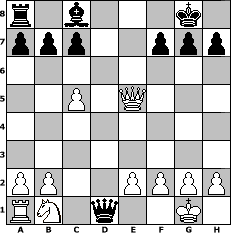 Partie-Notation im PGN-Format [Event "Kleins Blitzel"] [Site "www.mySchach.de"] [Date "2004.07.27"] [Round "1"] [White "Hobbykegler"] [Black "Knight"] [ECO "C55"] [WhitemyELO "1058"] [BlackmyELO "1395"] [Result "0-1"] [TimeControl "10/864000"] [WhiteDays "08"] [BlackDays "10"] [MySchachNr "5874"] 1. e4 e5 2. Nf3 Nc6 3. Bc4 Nf6 4. O-O Nxe4 5. d3 Nd6 6. Ng5 Nxc4 7. dxc4 Nd4 8. Re1 d6 9. c5 Be7 10. c3 Bxg5 11. cxd4 Bxc1 12. Qxc1 O-O 13. dxe5 dxe5 14. Rxe5 Re8 15. Qe1 Rxe5 16. Qxe5 Qd1+ 0-1 Stellungs-Notation im FEN-Format r1b3k1/ppp2ppp/8/2P1Q3/8/8/PP2PPPP/RN1q2K1 - - - 1 17 Geschlagene Figuren Weiss: Geschlagene Figuren Schwarz: Klicken Sie auf eine geschlagene Figur um den gewünschten Zug darzustellen!