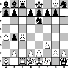 Partie-Notation im PGN-Format [Event "960 ChessSpa"] [Site "www.mySchach.de"] [Date "2005.11.11"] [Round "2"] [White "bane"] [Black "Kitama"] [Variant "Fischerrandom"] [SetUp "1"] [FEN "bbrqknrn/pppppppp/8/8/8/8/PPPPPPPP/BBRQKNRN w KQkq - 0 1"] [WhitemyELO "1829"] [BlackmyELO "1660"] [Result "1-0"] [TimeControl "10/2592000"] [WhiteDays "30"] [BlackDays "00"] [MySchachNr "19464"] 1. b4 Ne6 2. f3 c5 3. c3 Qb6 4. a4 cxb4 5. c4 Qxg1 6. Bxh7 Qxh1 7. Bxg8 1-0 Stellungs-Notation im FEN-Format bbr1k1Bn/pp1pppp1/4n3/8/PpP5/5P2/1P1PP1PP/B1RQKN1q - Qkq - 0 7 Geschlagene Figuren Weiss: ![]() ![]() ![]() ![]() ![]() ![]() ![]() ![]() ![]() ![]() ![]() ![]() ![]() ![]() ![]() Geschlagene Figuren Schwarz: ![]() ![]() ![]() ![]() ![]() ![]() ![]() ![]() ![]() ![]() ![]() ![]() ![]() ![]() ![]() Klicken Sie auf eine geschlagene Figur um den gewünschten Zug darzustellen!