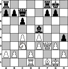 Partie-Notation im PGN-Format [Event "Abermals Aljechin"] [Site "www.mySchach.de"] [Date "2011.02.13"] [Round "1"] [White "reisinger"] [Black "woern63"] [ECO "A52"] [WhitemyELO "1426"] [BlackmyELO "1845"] [Result "0-1"] [TimeControl "10/1728000"] [WhiteDays "60"] [BlackDays "40"] [MySchachNr "71970"] 1. d4 Nf6 2. c4 e5 3. dxe5 Ng4 4. e4 d6 5. exd6 Bxd6 6. Be2 Nf6 7. Nc3 O-O 8. Nf3 Nc6 9. Be3 Ng4 10. O-O Nxe3 11. fxe3 Ne5 12. Qc2 c6 13. Rad1 Qc7 14. Nxe5 Bxe5 15. g3 Bh3 16. Rf3 h5 17. Bf1 Bg4 18. Qf2 Bxf3 19. Qxf3 h4 0-1 Stellungs-Notation im FEN-Format r4rk1/ppq2pp1/2p5/4b3/2P1P2p/2N1PQP1/PP1P3P/3R1BK1 - - - 0 20 Geschlagene Figuren Weiss: Geschlagene Figuren Schwarz: Klicken Sie auf eine geschlagene Figur um den gewünschten Zug darzustellen!