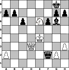 Partie-Notation im PGN-Format [Event "Wrixum-Open die IV"] [Site "www.mySchach.de"] [Date "2007.09.04"] [Round "1"] [White "lure"] [Black "HenrySchinasky"] [ECO "C21"] [WhitemyELO "1561"] [BlackmyELO "1878"] [Result "0-1"] [TimeControl "10/2592000"] [WhiteDays "28"] [BlackDays "30"] [MySchachNr "37803"] 1. e4 e5 2. d4 exd4 3. c3 dxc3 4. Bc4 d5 5. Bxd5 cxb2 6. Bxb2 Bb4+ 7. Nc3 Bxc3+ 8. Bxc3 Nf6 9. Nf3 Nxd5 10. exd5 Qe7+ 11. Kd2 O-O 12. Re1 Qc5 13. Qb3 Qxf2+ 14. Re2 Qb6 15. Qc2 Na6 16. Rb1 Qc5 17. Qd3 c6 18. Rbe1 f6 19. Re8 Bg4 20. Rxf8+ Rxf8 21. d6 Rd8 22. h3 Rxd6 23. Nd4 Bh5 24. Re6 Nb4 25. Bxb4 Qxb4+ 26. Ke3 Qe1+ 27. Kf4 Qf2+ 28. Ke4 Rxe6+ 29. Nxe6 Bg6# 0-1 Stellungs-Notation im FEN-Format 6k1/pp4pp/2p1Npb1/8/4K3/3Q3P/P4qP1/8 - - - 1 30 Geschlagene Figuren Weiss: Geschlagene Figuren Schwarz: Klicken Sie auf eine geschlagene Figur um den gewünschten Zug darzustellen!