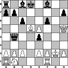 Partie-Notation im PGN-Format [Event "Lettisches Gambit"] [Site "www.mySchach.de"] [Date "2007.01.22"] [Round "1"] [White "rubellus"] [Black "ujack1961"] [ECO "C40"] [WhitemyELO "1516"] [BlackmyELO "1894"] [Result "0-1"] [TimeControl "10/2592000"] [WhiteDays "00"] [BlackDays "57"] [MySchachNr "31956"] 1. e4 e5 2. Nf3 f5 3. Nxe5 Nf6 4. Bc4 Qe7 5. d4 fxe4 6. Bg5 Nc6 7. Nf7 Rg8 8. O-O Qb4 9. Ne5 d5 10. Bxf6 gxf6 11. Qh5+ Kd8 12. Bxd5 Rxg2+ 13. Kxg2 Nxe5 14. dxe5 c6 0-1 Stellungs-Notation im FEN-Format r1bk1b2/pp5p/2p2p2/3BP2Q/1q2p3/8/PPP1PPKP/RN3R2 - - - 0 15 Geschlagene Figuren Weiss: Geschlagene Figuren Schwarz: Klicken Sie auf eine geschlagene Figur um den gewünschten Zug darzustellen!