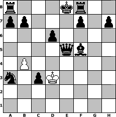 Partie-Notation im PGN-Format [Event "Sweety Tunier"] [Site "www.mySchach.de"] [Date "2006.02.28"] [Round "1"] [White "carlo"] [Black "Master1"] [ECO "C23"] [WhitemyELO "1046"] [BlackmyELO "1099"] [Result "0-1"] [TimeControl "10/2592000"] [WhiteDays "113"] [BlackDays "119"] [MySchachNr "22958"] 1. e4 e5 2. Bc4 Bc5 3. Qf3 Nf6 4. Qg3 Nxe4 5. Qxe5+ Qe7 6. Qxg7 Rf8 7. Ne2 Bxf2+ 8. Kf1 Nc6 9. d3 Bd4 10. c3 Bxg7 11. dxe4 Qxe4 12. Ng3 Qxc4+ 13. Ne2 Ne5 14. b3 Qd3 15. Ba3 Qd1+ 16. Kf2 Qxh1 17. h3 Nd3+ 18. Kg3 Be5+ 19. Kf3 Ne1+ 20. Ke3 Nc2+ 21. Ke4 Nxa1 22. Kxe5 d6+ 23. Kd4 Qxb1 24. Nf4 Nc2+ 25. Ke4 Nxa3+ 26. Nd3 Qxa2 27. Nb4 Qxg2+ 28. Kd4 c5+ 29. Kd3 Qxh3+ 30. Ke4 Qf5+ 31. Ke3 cxb4 32. Kd4 Qe5+ 33. Kd3 bxc3 34. b4 Bf5# 0-1 Stellungs-Notation im FEN-Format r3kr2/pp3p1p/3p4/4qb2/1P6/n1pK4/8/8 - q - 1 35 Geschlagene Figuren Weiss: Geschlagene Figuren Schwarz: Klicken Sie auf eine geschlagene Figur um den gewünschten Zug darzustellen!