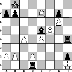 Partie-Notation im PGN-Format [Event "Abermals Aljechin"] [Site "www.mySchach.de"] [Date "2011.02.13"] [Round "1"] [White "Schefsche"] [Black "muellerh"] [ECO "A52"] [WhitemyELO "1361"] [BlackmyELO "1531"] [Result "0-1"] [TimeControl "10/1728000"] [WhiteDays "59"] [BlackDays "65"] [MySchachNr "71971"] 1. d4 Nf6 2. c4 e5 3. dxe5 Ng4 4. e4 d6 5. h3 Nxe5 6. Nf3 Qf6 7. Bg5 Nxf3+ 8. Qxf3 Qxg5 9. Bd3 Nc6 10. O-O Ne5 11. Qd1 Bxh3 12. g3 Bxf1 13. Bxf1 O-O-O 14. Nc3 h5 15. Nd5 h4 16. Bh3+ Kb8 17. g4 c6 18. f4 Qg6 19. fxe5 cxd5 20. Qxd5 Be7 21. Rf1 dxe5 22. Qxe5+ Bd6 23. Qf5 Qh6 24. g5 Qh5 25. Bg4 Qh7 26. Qxh7 Rxh7 27. Rxf7 h3 28. g6 Rh4 29. Bf5 h2+ 30. Kh1 Be5 31. Re7 Rd1+ 0-1 Stellungs-Notation im FEN-Format 1k6/pp2R1p1/6P1/4bB2/2P1P2r/8/PP1P3p/3r3K - - - 4 32 Geschlagene Figuren Weiss: Geschlagene Figuren Schwarz: Klicken Sie auf eine geschlagene Figur um den gewünschten Zug darzustellen!