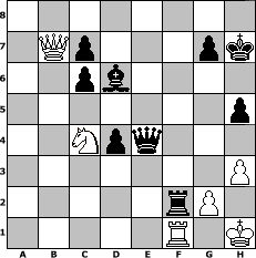 Partie-Notation im PGN-Format [Event ""Gewinne mit Schottisch""] [Site "www.mySchach.de"] [Date "2010.07.11"] [Round "2"] [White "Andylein1989"] [Black "espero"] [ECO "C21"] [WhitemyELO "1618"] [BlackmyELO "1652"] [Result "0-1"] [TimeControl "10/1728000"] [WhiteDays "20"] [BlackDays "20"] [MySchachNr "66928"] 1. e4 e5 2. d4 exd4 3. Nf3 Nc6 4. Nxd4 Nf6 5. Bg5 Be7 6. Nxc6 bxc6 7. Nc3 h6 8. Bf4 Rb8 9. Rb1 Rb4 10. a3 Rb7 11. Bc4 O-O 12. O-O d6 13. h3 Be6 14. Qe2 Nd7 15. Bxe6 fxe6 16. Qc4 Nc5 17. b4 d5 18. exd5 exd5 19. Qe2 Rxf4 20. bxc5 Rxb1 21. Rxb1 Bxc5 22. Rf1 Qf6 23. Nd1 Bxa3 24. Ne3 Bd6 25. Ng4 Qg6 26. Qa6 Qxc2 27. Qxa7 Kh7 28. Qb8 h5 29. Ne3 Qe4 30. Qb7 Rf6 31. Kh1 d4 32. Nc4 Rxf2 0-1 Stellungs-Notation im FEN-Format 8/1Qp3pk/2pb4/7p/2Npq3/7P/5rP1/5R1K - - - 0 33 Geschlagene Figuren Weiss: Geschlagene Figuren Schwarz: Klicken Sie auf eine geschlagene Figur um den gewünschten Zug darzustellen!