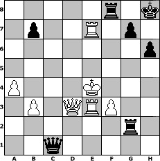 Partie-Notation im PGN-Format [Event "Faires Schach"] [Site "www.mySchach.de"] [Date "2007.03.25"] [Round "1"] [White "Andreas"] [Black "thw"] [ECO "C02"] [WhitemyELO "1619"] [BlackmyELO "1524"] [Result "1/2-1/2"] [TimeControl "10/3456000"] [WhiteDays "238"] [BlackDays "238"] [MySchachNr "33751"] 1. e4 e6 2. d4 d5 3. e5 c5 4. c3 Nc6 5. Nf3 Qb6 6. Bd3 cxd4 7. cxd4 Bd7 8. O-O Nxd4 9. Nxd4 Qxd4 10. Nc3 a6 11. g3 Ne7 12. Re1 Nc6 13. Be3 Qb4 14. Na4 Nd4 15. Bxd4 Bxa4 16. b3 Bc6 17. Bb2 Bc5 18. Rc1 Qb6 19. Re2 Rc8 20. Rec2 Bd4 21. Bxd4 Qxd4 22. Qe2 O-O 23. Bxa6 Ra8 24. Bd3 Ra3 25. Rd1 Qa7 26. Rdd2 Ra8 27. h4 Qb8 28. h5 h6 29. g4 Qd8 30. f3 Qh4 31. Qf2 Qg5 32. Qe2 Qf4 33. Kg2 R3a5 34. a4 d4 35. Be4 Rxe5 36. Rxd4 f5 37. gxf5 Qg5+ 38. Kf1 Bxe4 39. Rxe4 Rxf5 40. Rxe6 Qxh5 41. Re3 Qh1+ 42. Kf2 Raf8 43. Rcc3 Rg5 44. Qc4+ Kh8 45. Re7 Qg1+ 46. Ke2 Rg2+ 47. Kd3 Qd1+ 48. Ke4 Qe1+ 49. Re3 Qb1+ 50. Qd3 Qc1 51. Qc3 Qb1+ 52. Qd3 Qc1 1/2-1/2 Stellungs-Notation im FEN-Format 5r1k/1p2R1p1/7p/8/P3K3/1P1QRP2/6r1/2q5 - - - 24 53 Geschlagene Figuren Weiss: Geschlagene Figuren Schwarz: Klicken Sie auf eine geschlagene Figur um den gewünschten Zug darzustellen!