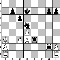 Partie-Notation im PGN-Format [Event "Herbstturnier 2025"] [Site "www.mySchach.de"] [Date "2025.09.16"] [Round "1"] [White "kalle"] [Black "deepsabel"] [ECO "C63"] [WhitemyELO "1623"] [BlackmyELO "1798"] [Result "0-1"] [TimeControl "10/1728000"] [WhiteDays "52"] [BlackDays "59"] [MySchachNr "133681"] 1. e4 e5 2. Nf3 Nc6 3. Bb5 f5 4. Nc3 fxe4 5. Nxe4 d5 6. Nxe5 dxe4 7. Nxc6 Qg5 8. Qe2 Nf6 9. f4 Qxf4 10. Nxa7+ Bd7 11. Bxd7+ Kxd7 12. Nb5 c6 13. Nc3 Bb4 14. d3 Bxc3+ 15. bxc3 Qf5 16. Qf2 Qxf2+ 17. Kxf2 Rhf8 18. Ke2 exd3+ 19. cxd3 Rae8+ 20. Kd2 Nd5 21. d4 Rf2+ 22. Kd3 Rxg2 23. Ba3 Re3+ 0-1 Stellungs-Notation im FEN-Format 8/1p1k2pp/2p5/3n4/3P4/B1PKr3/P5rP/R6R - - - 2 24 Geschlagene Figuren Weiss: Geschlagene Figuren Schwarz: Klicken Sie auf eine geschlagene Figur um den gewünschten Zug darzustellen!