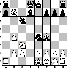 Partie-Notation im PGN-Format [Event "HIGHLAND QUEEN II 2014"] [Site "www.mySchach.de"] [Date "2014.02.11"] [Round "1"] [White "Peterlie77 (C)"] [Black "woern63"] [ECO "A13"] [WhitemyELO "2051"] [BlackmyELO "1931"] [Result "1-0"] [TimeControl "10/2592000"] [WhiteDays "30"] [BlackDays "30"] [MySchachNr "92841"] 1. c4 e6 2. d4 d5 3. Nc3 c5 4. cxd5 cxd4 5. Qa4+ Bd7 6. Qxd4 exd5 7. Qxd5 Nf6 8. Qxb7 Nc6 9. Bf4 Bb4 10. a3 Ne4 11. axb4 1-0 Stellungs-Notation im FEN-Format r2qk2r/pQ1b1ppp/2n5/8/1P2nB2/2N5/1PP1PPPP/R3KBNR - KQkq - 0 11 Geschlagene Figuren Weiss: Geschlagene Figuren Schwarz: Klicken Sie auf eine geschlagene Figur um den gewünschten Zug darzustellen!