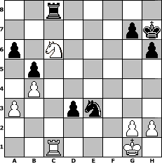 | Partie-Notation im PGN-Format [Event "Oktober Schach"] [Site "www.mySchach.de"] [Date "2008.10.04"] [Round "1"] [White "thw"] [Black "Vahl1"] [ECO "C42"] [WhitemyELO "1486"] [BlackmyELO "1645"] [Result "0-1"] [TimeControl "10/864000"] [WhiteDays "10"] [BlackDays "10"] [MySchachNr "48608"] 1. e4 e5 2. Nf3 Nf6 3. Nxe5 d6 4. Nf3 Nxe4 5. Qe2 Qe7 6. d3 Nf6 7. Bg5 Qxe2+ 8. Bxe2 Be7 9. Nc3 h6 10. Bxf6 Bxf6 11. Nd5 Bd8 12. O-O O-O 13. Rfe1 c6 14. Ne3 d5 15. d4 Bf6 16. c3 Be6 17. Ne5 Bxe5 18. dxe5 Nd7 19. f4 f6 20. f5 Bxf5 21. Nxf5 fxe5 22. Ng3 e4 23. c4 Nf6 24. cxd5 cxd5 25. Rac1 a6 26. Rc7 b5 27. Nf5 Ne8 28. Ne7+ Kh7 29. Rd7 Nf6 30. Rd6 Rfd8 31. Rxd8 Rxd8 32. Rc1 d4 33. Nc6 Rc8 34. b4 d3 35. Bf1 Nd5 36. a3 Ne3 37. Bxd3 exd3 0-1 Stellungs-Notation im FEN-Format 2r5/6pk/p1N4p/1p6/1P6/P2pn3/6PP/2R3K1 - - - 0 38 Geschlagene Figuren Weiss:                              Geschlagene Figuren Schwarz:                               Klicken Sie auf eine geschlagene Figur um den gewünschten Zug darzustellen!