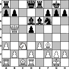 Partie-Notation im PGN-Format [Event "Februar 2018"] [Site "www.mySchach.de"] [Date "2018.02.03"] [Round "1"] [White "Seneca"] [Black "Knight"] [ECO "D00"] [WhitemyELO "1426"] [BlackmyELO "1091"] [Result "1-0"] [TimeControl "10/1728000"] [WhiteDays "27"] [BlackDays "00"] [MySchachNr "111245"] 1. d4 d5 2. e3 Nc6 3. c3 e5 4. dxe5 Nxe5 5. Nf3 Nc6 6. Be2 Nf6 7. O-O Bd6 8. Nd4 Nxd4 9. cxd4 O-O 10. Nc3 Re8 11. a3 c5 12. Bf3 cxd4 13. Qxd4 Be5 14. Qc5 Be6 15. Rd1 Bd6 16. Qb5 1-0 Stellungs-Notation im FEN-Format r2qr1k1/pp3ppp/3bbn2/1Q1p4/8/P1N1PB2/1P1P1PPP/R1BR2K1 - - - 6 16 Geschlagene Figuren Weiss: Geschlagene Figuren Schwarz: Klicken Sie auf eine geschlagene Figur um den gewünschten Zug darzustellen!