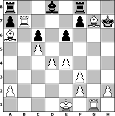 Partie-Notation im PGN-Format [Event "Testturnier"] [Site "www.mySchach.de"] [Date "2008.03.03"] [Round "2"] [White "Master1"] [Black "Helmut48"] [ECO "D02"] [WhitemyELO "1290"] [BlackmyELO "1367"] [Result "1-0"] [TimeControl "10/2592000"] [WhiteDays "51"] [BlackDays "60"] [MySchachNr "43085"] 1. d4 d5 2. Nf3 h6 3. c4 Nf6 4. Nc3 c6 5. cxd5 Nxd5 6. e4 Nxc3 7. bxc3 Bg4 8. Rb1 Qa5 9. Qd2 Bxf3 10. gxf3 e6 11. Rxb7 Nd7 12. c4 Qxd2+ 13. Bxd2 Be7 14. c5 Nb8 15. Bf4 Na6 16. Bxa6 Bd8 17. Rg1 O-O 18. Bxh6 Kh7 19. Bxg7 1-0 Stellungs-Notation im FEN-Format r2b1r2/pR3pBk/B1p1p3/2P5/3PP3/5P2/P4P1P/4K1R1 - - - 0 19 Geschlagene Figuren Weiss: Geschlagene Figuren Schwarz: Klicken Sie auf eine geschlagene Figur um den gewünschten Zug darzustellen!