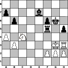 Partie-Notation im PGN-Format [Event "Schach dem Osterhasen IV"] [Site "www.mySchach.de"] [Date "2015.03.29"] [Round "1"] [White "Schefsche"] [Black "alpacino"] [ECO "C21"] [WhitemyELO "1470"] [BlackmyELO "1273"] [Result "1/2-1/2"] [TimeControl "10/2592000"] [WhiteDays "105"] [BlackDays "106"] [MySchachNr "98721"] 1. e4 e5 2. d4 exd4 3. Nf3 c5 4. Bc4 Qe7 5. Qd3 Nc6 6. O-O Nb4 7. Qe2 Nf6 8. Re1 d6 9. a3 Nc6 10. e5 dxe5 11. Nxe5 Nxe5 12. Qxe5 Qxe5 13. Rxe5+ Be7 14. Bg5 h6 15. Bxf6 gxf6 16. Re1 b6 17. Bb5+ Bd7 18. Bxd7+ Kxd7 19. Nd2 h5 20. Rad1 f5 21. Nc4 f6 22. c3 Rhd8 23. cxd4 cxd4 24. Rxd4+ Ke8 25. Rxd8+ Rxd8 26. Kf1 Rd4 27. b3 Kf7 28. a4 Rd3 29. Re3 Rd1+ 30. Ke2 Rd5 31. Rh3 f4 32. Kf3 Kg6 33. Kxf4 Rf5+ 34. Kg3 Rg5+ 35. Kf3 Rf5+ 36. Kg3 1/2-1/2 Stellungs-Notation im FEN-Format 8/p3b3/1p3pk1/5r1p/P1N5/1P4KR/5PPP/8 - - - 6 36 Geschlagene Figuren Weiss: Geschlagene Figuren Schwarz: Klicken Sie auf eine geschlagene Figur um den gewünschten Zug darzustellen!
