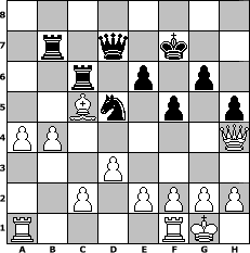 Partie-Notation im PGN-Format [Event "1.Schaltjahresturnier@mySchach"] [Site "www.mySchach.de"] [Date "2004.02.29"] [Round "1"] [White "HPB2005"] [Black "Naunhofer"] [ECO "B23"] [WhitemyELO "1625"] [BlackmyELO "1481"] [Result "1-0"] [TimeControl "10/1728000"] [WhiteDays "58"] [BlackDays "58"] [MySchachNr "2626"] 1. e4 c5 2. Nc3 Nc6 3. Nf3 e6 4. Bb5 a6 5. Bxc6 bxc6 6. O-O d5 7. d3 Rb8 8. b3 Be7 9. Bf4 Rb7 10. Ne5 Bd7 11. Qh5 g6 12. Qh3 Bf6 13. Qf3 Bxe5 14. Bxe5 f6 15. Bd6 f5 16. exd5 cxd5 17. Nxd5 Bc6 18. Nf6+ Nxf6 19. Qxc6+ Qd7 20. Qxa6 Kf7 21. Bxc5 Rc8 22. b4 Rc6 23. Qc4 Nd5 24. Qh4 h5 25. a4 1-0 Stellungs-Notation im FEN-Format 8/1r1q1k2/2r1p1p1/2Bn1p1p/PP5Q/3P4/2P1PPPP/R4RK1 - - - 0 25 Geschlagene Figuren Weiss: ![]() ![]() ![]() ![]() ![]() ![]() ![]() ![]() ![]() ![]() ![]() ![]() ![]() ![]() ![]() Geschlagene Figuren Schwarz: ![]() ![]() ![]() ![]() ![]() ![]() ![]() ![]() ![]() ![]() ![]() ![]() ![]() ![]() ![]() Klicken Sie auf eine geschlagene Figur um den gewünschten Zug darzustellen!