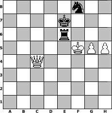 Partie-Notation im PGN-Format [Event "und immer wieder Schach !"] [Site "www.mySchach.de"] [Date "2009.11.06"] [Round "1"] [White "Ostseeboy"] [Black "Joschi"] [ECO "A03"] [WhitemyELO "1202"] [BlackmyELO "1562"] [Result "1-0"] [TimeControl "10/864000"] [WhiteDays "70"] [BlackDays "57"] [MySchachNr "60424"] 1. f4 d5 2. Nf3 Nc6 3. e3 Bg4 4. Be2 Nf6 5. O-O e6 6. c4 dxc4 7. b3 cxb3 8. axb3 Bb4 9. Ba3 O-O 10. Bxb4 Nxb4 11. Ra4 Nd3 12. Rd4 Qxd4 13. Nxd4 Bxe2 14. Qxe2 Nc5 15. b4 Nce4 16. d3 Nd6 17. Nc3 a6 18. e4 Nd7 19. e5 Nc8 20. f5 exf5 21. Rxf5 Ndb6 22. e6 Nd6 23. exf7+ Rxf7 24. Rxf7 Nxf7 25. Qe7 Rc8 26. Ne6 h6 27. Ne4 Nd5 28. Qd7 Nb6 29. Qe7 Nd5 30. Qc5 c6 31. Nd6 Rb8 32. Nxf7 Kxf7 33. Nd4 Re8 34. Kf2 Nf6 35. Qb6 Re7 36. Nf5 Rd7 37. Qc5 Rxd3 38. Nd6+ Kg8 39. Nxb7 Rd5 40. Qxc6 Rb5 41. Qxa6 Rxb4 42. Qe6+ Kh7 43. Nc5 Rb2+ 44. Kf3 Rb5 45. Qf5+ Kh8 46. Qe5 Kh7 47. g4 Rb4 48. Ne6 Rb3+ 49. Kg2 Rb4 50. Qf5+ Kh8 51. h3 Rb2+ 52. Kg3 Rb3+ 53. Kh4 g5+ 54. Nxg5 hxg5+ 55. Kxg5 Nh7+ 56. Kh4 Re3 57. Qc8+ Kg7 58. Qb7+ Kg8 59. Qc8+ Nf8 60. Qc4+ Re6 61. Kg5 Kf7 62. Kf5 Ke7 63. g5 Kd7 64. h4 Ke7 65. h5 1-0 Stellungs-Notation im FEN-Format 5n2/4k3/4r3/5KPP/2Q5/8/8/8 - - - 0 65 Geschlagene Figuren Weiss: Geschlagene Figuren Schwarz: Klicken Sie auf eine geschlagene Figur um den gewünschten Zug darzustellen!