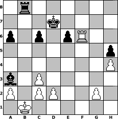 Partie-Notation im PGN-Format [Event "^^Lust, Laune und Spannung am Schach!!!^^"] [Site "www.mySchach.de"] [Date "2007.09.24"] [Round "1"] [White "Knight"] [Black "Helmut48"] [ECO "D00"] [WhitemyELO "1290"] [BlackmyELO "1446"] [Result "0-1"] [TimeControl "10/864000"] [WhiteDays "29"] [BlackDays "30"] [MySchachNr "38460"] 1. d4 d5 2. e4 dxe4 3. Nc3 Nf6 4. f3 exf3 5. Qxf3 Qxd4 6. Be3 Qe5 7. O-O-O Nc6 8. Bf4 Bg4 9. Nb5 Qxb5 10. Bxb5 Bxf3 11. Nxf3 a6 12. Bxc6+ bxc6 13. Bxc7 e6 14. Ne5 Nd5 15. Ba5 Rc8 16. Rhf1 f6 17. Ng4 Bd6 18. Bc3 Rd8 19. Ba5 Rd7 20. h4 h5 21. Nxf6+ gxf6 22. Bc3 Nxc3 23. bxc3 Ba3+ 24. Kb1 Ke7 25. Rxd7+ Kxd7 26. Rxf6 Rb8+ 0-1 Stellungs-Notation im FEN-Format 1r6/3k4/p1p1pR2/7p/7P/b1P5/P1PP2P1/1K6 - - - 1 27 Geschlagene Figuren Weiss: Geschlagene Figuren Schwarz: Klicken Sie auf eine geschlagene Figur um den gewünschten Zug darzustellen!