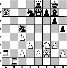 Partie-Notation im PGN-Format [Event "Einstand"] [Site "www.mySchach.de"] [Date "2010.12.10"] [Round "1"] [White "Duschgel"] [Black "reisender"] [ECO "A21"] [WhitemyELO "1549"] [BlackmyELO "1328"] [Result "1/2-1/2"] [TimeControl "10/864000"] [WhiteDays "10"] [BlackDays "10"] [MySchachNr "70473"] 1. c4 e5 2. Nc3 d6 3. g3 g6 4. Bg2 Bg7 5. d3 Nd7 6. Nf3 Ngf6 7. O-O O-O 8. b4 c6 9. a4 b6 10. Nd2 Bb7 11. b5 Rc8 12. Ba3 Qc7 13. bxc6 Bxc6 14. Bxc6 Qxc6 15. Nb5 Nc5 16. Nxa7 Qb7 17. Nxc8 Rxc8 18. Rb1 Qa8 19. Rxb6 Nxa4 20. Rxd6 Nc3 21. Qe1 Qxa3 22. Rb6 Qa7 23. Rb3 Na4 24. Qb1 Nc5 25. Rb5 Bf8 26. Qb2 Re8 27. Ra1 Qe7 28. Rb6 Bg7 29. Qa3 Nfd7 30. Rbb1 e4 31. Ra2 e3 32. Nf3 exf2+ 33. Kxf2 h5 34. Qa7 1/2-1/2 Stellungs-Notation im FEN-Format 4r1k1/Q2nqpb1/6p1/2n4p/2P5/3P1NP1/R1P1PK1P/1R6 - - - 1 34 Geschlagene Figuren Weiss: Geschlagene Figuren Schwarz: Klicken Sie auf eine geschlagene Figur um den gewünschten Zug darzustellen!