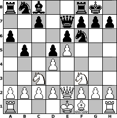 Partie-Notation im PGN-Format [Event "Der HSF feiert 3.Geburtstag-feiert dabei gern mit!"] [Site "www.mySchach.de"] [Date "2013.05.01"] [Round "1"] [White "zidan"] [Black "Gauss1233"] [ECO "A46"] [WhitemyELO "1318"] [BlackmyELO "1440"] [Result "0-1"] [TimeControl "10/2592000"] [WhiteDays "00"] [BlackDays "26"] [MySchachNr "88043"] 1. d4 Nf6 2. Nf3 e6 3. Bf4 d5 4. Nc3 a6 5. e3 Bd6 6. Bxd6 Qxd6 7. Qe2 O-O 8. e4 b5 9. e5 Qe7 0-1 Stellungs-Notation im FEN-Format rnb2rk1/2p1qppp/p3pn2/1p1pP3/3P4/2N2N2/PPPPQPPP/R3KB1R - KQ - 1 10 Geschlagene Figuren Weiss: Geschlagene Figuren Schwarz: Klicken Sie auf eine geschlagene Figur um den gewünschten Zug darzustellen!