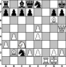 Partie-Notation im PGN-Format [Event "Albspiele 24"] [Site "www.mySchach.de"] [Date "2012.11.07"] [Round "1"] [White "wiesel"] [Black "Wulfen49"] [ECO "C47"] [WhitemyELO "1172"] [BlackmyELO "1213"] [Result "1-0"] [TimeControl "10/1728000"] [WhiteDays "19"] [BlackDays "20"] [MySchachNr "84946"] 1. e4 e5 2. Nf3 Nc6 3. Nc3 Nf6 4. Bc4 Bb4 5. O-O O-O 6. a3 Nd4 7. Nxe5 Bd6 8. f4 Bc5 9. b4 Bd6 10. Bb2 Bxe5 11. fxe5 Ne8 12. Qh5 Nxc2 13. Bxf7+ Kh8 14. Bg6 Rxf1+ 15. Rxf1 1-0 Stellungs-Notation im FEN-Format r1bqn2k/pppp2pp/6B1/4P2Q/1P2P3/P1N5/1BnPP1PP/5RK1 - - - 0 15 Geschlagene Figuren Weiss: Geschlagene Figuren Schwarz: Klicken Sie auf eine geschlagene Figur um den gewünschten Zug darzustellen!