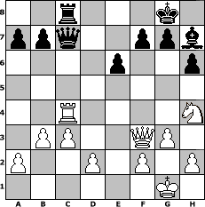 Partie-Notation im PGN-Format [Event "1. CQS Clubmeisterschaft 2011"] [Site "www.mySchach.de"] [Date "2011.07.30"] [Round "1"] [White "martinus"] [Black "Svetlana"] [ECO "D02"] [WhitemyELO "1736"] [BlackmyELO "1726"] [Result "1/2-1/2"] [TimeControl "10/2592000"] [WhiteDays "27"] [BlackDays "25"] [MySchachNr "75286"] 1. d4 d5 2. Nf3 Nf6 3. g3 c6 4. Bg2 Bf5 5. Nc3 e6 6. O-O h6 7. Bf4 Bd6 8. Bxd6 Qxd6 9. Re1 Nbd7 10. Nh4 Bh7 11. e4 Nxe4 12. Bxe4 dxe4 13. Nxe4 Qc7 14. Qe2 O-O 15. Rad1 Rfd8 16. c3 Qb6 17. Nd6 c5 18. Nc4 Qa6 19. b3 cxd4 20. Rxd4 Nb6 21. Nxb6 Qxb6 22. Rd1 Rxd4 23. Rxd4 Rc8 24. Qf3 Qc7 25. Rc4 1/2-1/2 Stellungs-Notation im FEN-Format 2r3k1/ppq2ppb/4p2p/8/2R4N/1PP2QP1/P2P1P1P/6K1 - - - 4 25 Geschlagene Figuren Weiss: Geschlagene Figuren Schwarz: Klicken Sie auf eine geschlagene Figur um den gewünschten Zug darzustellen!