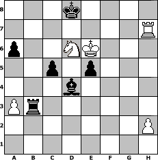 Partie-Notation im PGN-Format [Event "7er"] [Site "www.mySchach.de"] [Date "2010.04.18"] [Round "1"] [White "Lohl"] [Black "Jolilein"] [ECO "B33"] [WhitemyELO "1556"] [BlackmyELO "1880"] [Result "1-0"] [TimeControl "10/2592000"] [WhiteDays "25"] [BlackDays "24"] [MySchachNr "64939"] 1. e4 c5 2. Nf3 Nc6 3. d4 cxd4 4. Nxd4 Nf6 5. Nc3 d6 6. Bg5 e6 7. Bb5 Bd7 8. Ba4 Be7 9. Ndb5 Qb8 10. Bxf6 gxf6 11. Nd4 a6 12. Nxc6 Bxc6 13. Bxc6+ bxc6 14. Rb1 d5 15. O-O dxe4 16. Nxe4 f5 17. Ng3 Qf4 18. Qe2 h5 19. Rfd1 h4 20. Nf1 h3 21. g3 Qg4 22. Qxg4 fxg4 23. Ne3 Rg8 24. Rd4 f5 25. Nc4 Rd8 26. Rxd8+ Kxd8 27. Kf1 Re8 28. Rd1+ Kc7 29. c3 Bf6 30. Ke2 Bg5 31. Rd6 Bc1 32. b3 Bh6 33. f4 gxf3+ 34. Kxf3 Bf8 35. Rd1 Bg7 36. g4 fxg4+ 37. Kxg4 Rg8 38. Kxh3 Bxc3 39. Rd3 Bf6 40. Rg3 Rh8+ 41. Kg2 Bd4 42. Rh3 Rf8 43. Rh7+ Kd8 44. Na5 c5 45. Kg3 Be5+ 46. Kh3 Bd4 47. Kg4 Rf2 48. a3 e5 49. Nb7+ Ke8 50. Nd6+ Kd8 51. Kg5 Rb2 52. Kf5 Rxb3 53. Ke6 1-0 Stellungs-Notation im FEN-Format 3k4/7R/p2NK3/2p1p3/3b4/Pr6/7P/8 - - - 1 53 Geschlagene Figuren Weiss: Geschlagene Figuren Schwarz: Klicken Sie auf eine geschlagene Figur um den gewünschten Zug darzustellen!
