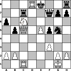 Partie-Notation im PGN-Format [Event "Ab in den Herbst"] [Site "www.mySchach.de"] [Date "2014.09.23"] [Round "1"] [White "espero"] [Black "muellerh"] [ECO "D00"] [WhitemyELO "1770"] [BlackmyELO "1498"] [Result "1-0"] [TimeControl "10/864000"] [WhiteDays "10"] [BlackDays "04"] [MySchachNr "96029"] 1. d4 d5 2. Bf4 Nc6 3. e3 Nf6 4. c3 Bf5 5. Bd3 Bxd3 6. Qxd3 e6 7. Nf3 Bd6 8. O-O Bxf4 9. exf4 Ne4 10. Nbd2 f5 11. Ne5 Nxe5 12. fxe5 a6 13. Nb3 b6 14. f3 Ng5 15. c4 dxc4 16. Qxc4 b5 17. Qc5 Qd7 18. Rac1 Rc8 19. Rfd1 c6 20. d5 exd5 21. Rxd5 Qb7 22. Na5 Qf7 23. Nxc6 Rc7 24. Rd8# 1-0 Stellungs-Notation im FEN-Format 3Rk2r/2r2qpp/p1N5/1pQ1Ppn1/8/5P2/PP4PP/2R3K1 - k - 2 24 Geschlagene Figuren Weiss: ![]() ![]() ![]() ![]() ![]() ![]() ![]() ![]() ![]() ![]() ![]() ![]() ![]() ![]() ![]() Geschlagene Figuren Schwarz: ![]() ![]() ![]() ![]() ![]() ![]() ![]() ![]() ![]() ![]() ![]() ![]() ![]() ![]() ![]() Klicken Sie auf eine geschlagene Figur um den gewünschten Zug darzustellen!