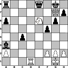 | Partie-Notation im PGN-Format [Event "Oktober Schach"] [Site "www.mySchach.de"] [Date "2008.10.04"] [Round "1"] [White "Caligula"] [Black "Ostseeboy"] [ECO "B20"] [WhitemyELO "1427"] [BlackmyELO "1302"] [Result "1-0"] [TimeControl "10/864000"] [WhiteDays "10"] [BlackDays "10"] [MySchachNr "48609"] 1. e4 c5 2. d4 e6 3. Nf3 Nf6 4. e5 Nd5 5. Bc4 Nb6 6. Be2 Be7 7. O-O O-O 8. Nc3 Nc6 9. Be3 cxd4 10. Bxd4 Nxd4 11. Qxd4 Qc7 12. b4 d6 13. Rac1 dxe5 14. Nxe5 Rd8 15. Qe3 Bxb4 16. Nb5 Qe7 17. Bd3 Nd5 18. Qh3 g6 19. c4 Nf4 20. Qf3 Nxd3 21. Nxd3 a6 22. Nc3 b5 23. Ne4 Ba3 24. Rcd1 Bb7 25. Rfe1 bxc4 26. Nf4 Rxd1 27. Rxd1 f5 28. Nf6+ Qxf6 29. Qxb7 Qf8 30. Nxe6 Qe8 31. Qg7# 1-0 Stellungs-Notation im FEN-Format r3q1k1/6Qp/p3N1p1/5p2/2p5/b7/P4PPP/3R2K1 - - - 2 31 Geschlagene Figuren Weiss:                              Geschlagene Figuren Schwarz:                               Klicken Sie auf eine geschlagene Figur um den gewünschten Zug darzustellen!