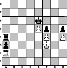 Partie-Notation im PGN-Format [Event "Schach dem Osterhasen V"] [Site "www.mySchach.de"] [Date "2016.03.17"] [Round "1"] [White "Seneca"] [Black "Caligula"] [ECO "D00"] [WhitemyELO "1509"] [BlackmyELO "1270"] [Result "1/2-1/2"] [TimeControl "10/2592000"] [WhiteDays "174"] [BlackDays "174"] [MySchachNr "102979"] 1. d4 d5 2. e3 Nf6 3. Bd3 e6 4. Nd2 c5 5. c3 c4 6. Bc2 Nc6 7. Ngf3 b5 8. b3 a5 9. O-O Be7 10. bxc4 bxc4 11. e4 O-O 12. h3 Bd7 13. e5 Ne4 14. Nxe4 dxe4 15. Bxe4 f5 16. Bc2 Rb8 17. Qe2 h6 18. Qxc4 Kh8 19. Ba4 Rc8 20. Bxc6 Rxc6 21. Qd3 Qc8 22. Bd2 Rb6 23. Rab1 Rc6 24. Rb3 a4 25. Rb2 Qd8 26. Rfb1 Rc7 27. c4 Bc6 28. Re1 Bxf3 29. Qxf3 Qxd4 30. Rc2 Rxc4 31. Rxc4 Qxc4 32. a3 Qc2 33. Bc1 Qc8 34. Qd1 Qc3 35. Re2 Bxa3 36. Bxa3 Qxa3 37. Qd6 Qc1+ 38. Kh2 Re8 39. Qd7 Ra8 40. Qxe6 Qc8 41. Qd5 a3 42. Ra2 Qe8 43. f4 Qg8 44. Qxg8+ Kxg8 45. g4 g6 46. gxf5 gxf5 47. Kg3 Kf7 48. h4 Ke6 49. Kf3 h5 50. Ke3 Ra4 51. Kf3 1/2-1/2 Stellungs-Notation im FEN-Format 8/8/4k3/4Pp1p/r4P1P/p4K2/R7/8 - - - 3 51 Geschlagene Figuren Weiss: Geschlagene Figuren Schwarz: Klicken Sie auf eine geschlagene Figur um den gewünschten Zug darzustellen!