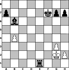 Partie-Notation im PGN-Format [Event "Mailüfterl"] [Site "www.mySchach.de"] [Date "2018.04.23"] [Round "1"] [White "alpacino"] [Black "Joschi"] [ECO "B11"] [WhitemyELO "1315"] [BlackmyELO "1503"] [Result "0-1"] [TimeControl "10/1728000"] [WhiteDays "100"] [BlackDays "100"] [MySchachNr "112037"] 1. e4 c6 2. Nc3 d5 3. d4 dxe4 4. Nxe4 Nd7 5. Bc4 Ngf6 6. Nxf6+ Nxf6 7. Bg5 e6 8. Bxf6 Qxf6 9. Nf3 Bd6 10. c3 b5 11. Bb3 O-O 12. O-O Bb7 13. Nd2 Qg6 14. Bc2 Qh6 15. g3 Qh3 16. Qf3 Rab8 17. Ne4 c5 18. dxc5 Bxc5 19. b4 Bb6 20. Qg2 Qxg2+ 21. Kxg2 f5 22. Kg1 fxe4 23. Bb3 Bd5 24. Bxd5 exd5 25. Rad1 Rfd8 26. a3 Rbc8 27. Rfe1 Rxc3 28. Ra1 Rc2 29. Rf1 Rf8 30. a4 bxa4 31. Rxa4 Rb2 32. Raa1 Rc8 33. Rad1 Rcc2 34. Rxd5 Rxf2 35. Rxf2 Rxf2 36. Kh1 e3 37. Re5 e2 38. Re8+ Kf7 39. Re4 Rf1+ 40. Kg2 e1=Q 41. Rxe1 Rxe1 0-1 Stellungs-Notation im FEN-Format 8/p4kpp/1b6/8/1P6/6P1/6KP/4r3 - - - 0 42 Geschlagene Figuren Weiss: Geschlagene Figuren Schwarz: Klicken Sie auf eine geschlagene Figur um den gewünschten Zug darzustellen!