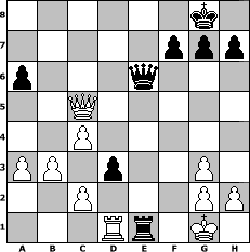 Partie-Notation im PGN-Format [Event "Schach dem Osterhasen IV"] [Site "www.mySchach.de"] [Date "2015.03.29"] [Round "1"] [White "alpacino"] [Black "beowulf"] [ECO "A30"] [WhitemyELO "1273"] [BlackmyELO "1344"] [Result "0-1"] [TimeControl "10/2592000"] [WhiteDays "111"] [BlackDays "079"] [MySchachNr "98699"] 1. c4 c5 2. Nf3 Nc6 3. e3 d6 4. a3 Bg4 5. Be2 Nf6 6. Nc3 e6 7. d3 Be7 8. Ng5 Bxe2 9. Qxe2 O-O 10. Nge4 Nxe4 11. Nxe4 a6 12. Ng3 b5 13. O-O bxc4 14. dxc4 d5 15. Rd1 Qc7 16. b3 d4 17. exd4 Nxd4 18. Qb2 Rfd8 19. Be3 e5 20. Qc3 Re8 21. Bxd4 exd4 22. Qd3 Bd6 23. Re1 Bxg3 24. fxg3 Qc6 25. Rxe8+ Rxe8 26. Rf1 Re3 27. Qf5 Qe6 28. Qxc5 d3 29. Rd1 Re1+ 0-1 Stellungs-Notation im FEN-Format 6k1/5ppp/p3q3/2Q5/2P5/PP1p2P1/2P3PP/3Rr1K1 - - - 2 30 Geschlagene Figuren Weiss: Geschlagene Figuren Schwarz: Klicken Sie auf eine geschlagene Figur um den gewünschten Zug darzustellen!