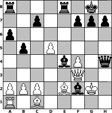 Partie-Notation im PGN-Format [Event "Sweety Tunier"] [Site "www.mySchach.de"] [Date "2006.02.28"] [Round "2"] [White "carlo"] [Black "Fussel"] [ECO "C24"] [WhitemyELO "1046"] [BlackmyELO "1461"] [Result "0-1"] [TimeControl "10/2592000"] [WhiteDays "81"] [BlackDays "52"] [MySchachNr "23019"] 1. e4 e5 2. Bc4 Nf6 3. Nc3 d5 4. exd5 a6 5. Nf3 Bd6 6. d4 O-O 7. dxe5 Re8 8. O-O Bxe5 9. Ng5 Bg4 10. f3 Bh5 11. g4 Bg6 12. h4 b5 13. Be2 Bg3 14. h5 Nxh5 15. gxh5 Bxh5 16. Qd3 Bg6 17. Nge4 Qh4 18. Rf2 Bxf2+ 19. Kg2 Nd7 20. f4 Nc5 21. Qf3 Nxe4 22. Nxe4 Bxe4 0-1 Stellungs-Notation im FEN-Format r3r1k1/2p2ppp/p7/1p1P4/4bP1q/5Q2/PPP1BbK1/R1B5 - - - 0 23 Geschlagene Figuren Weiss: Geschlagene Figuren Schwarz: Klicken Sie auf eine geschlagene Figur um den gewünschten Zug darzustellen!