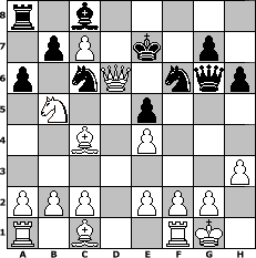 Partie-Notation im PGN-Format [Event "Unter uns Nr. 8"] [Site "www.mySchach.de"] [Date "2013.03.03"] [Round "1"] [White "Haki"] [Black "Haneken"] [ECO "C40"] [WhitemyELO "1226"] [BlackmyELO "1350"] [Result "1-0"] [TimeControl "10/864000"] [WhiteDays "20"] [BlackDays "20"] [MySchachNr "86931"] 1. e4 e5 2. Nf3 Bd6 3. Bc4 Bc5 4. O-O Nf6 5. Nc3 Nc6 6. Ng5 Ng4 7. Nxf7 Qh4 8. h3 Nf6 9. Nxh8 h6 10. Ng6 Qg5 11. d4 Qxg6 12. dxc5 d6 13. Nb5 Kd8 14. cxd6 a6 15. dxc7+ Ke7 16. Qd6+ 1-0 Stellungs-Notation im FEN-Format r1b5/1pP1k1p1/p1nQ1nqp/1N2p3/2B1P3/7P/PPP1PPP1/R1B2RK1 - - - 2 16 Geschlagene Figuren Weiss: Geschlagene Figuren Schwarz: Klicken Sie auf eine geschlagene Figur um den gewünschten Zug darzustellen!