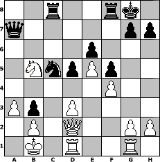 Partie-Notation im PGN-Format [Event "Bremer Schl"] [Site "www.mySchach.de"] [Date "2010.10.15"] [Round "1"] [White "dbuse"] [Black "PeterLoskarn"] [ECO "C14"] [WhitemyELO "2123"] [BlackmyELO "2153"] [Result "1/2-1/2"] [TimeControl "10/3456000"] [WhiteDays "80"] [BlackDays "97"] [MySchachNr "68973"] 1. e4 e6 2. d4 d5 3. Nc3 Nf6 4. Bg5 Be7 5. e5 Nfd7 6. Bxe7 Qxe7 7. f4 O-O 8. Nf3 c5 9. Qd2 Nc6 10. dxc5 Nxc5 11. O-O-O a6 12. Bd3 b5 13. Qf2 f6 14. Rhe1 f5 15. Ne2 Bd7 16. Rg1 Nb4 17. Kb1 Nbxd3 18. cxd3 b4 19. Ned4 Rac8 20. Qd2 b3 21. a3 Bb5 22. Nxb5 axb5 23. Nd4 Qa7 24. Nxb5 1/2-1/2 Stellungs-Notation im FEN-Format 2r2rk1/q5pp/4p3/1NnpPp2/5P2/Pp1P4/1P1Q2PP/1K1R2R1 - - - 0 24 Geschlagene Figuren Weiss: Geschlagene Figuren Schwarz: Klicken Sie auf eine geschlagene Figur um den gewünschten Zug darzustellen!