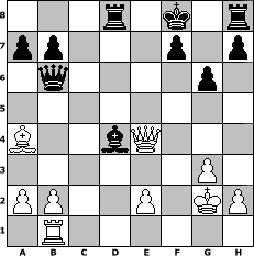 Partie-Notation im PGN-Format [Event "Es wurde noch etwas sommerlich."] [Site "www.mySchach.de"] [Date "2009.08.09"] [Round "1"] [White "Andylein1989"] [Black "Winston"] [ECO "B32"] [WhitemyELO "1592"] [BlackmyELO "1387"] [Result "0-1"] [TimeControl "10/2592000"] [WhiteDays "30"] [BlackDays "29"] [MySchachNr "58183"] 1. e4 c5 2. Nf3 Nc6 3. d4 cxd4 4. Nxd4 Qb6 5. c3 Nf6 6. Nxc6 Qxc6 7. Bd3 Nxe4 8. O-O d5 9. Be3 Qg6 10. Nd2 Bh3 11. g3 Bxf1 12. Qxf1 Nxd2 13. Bxd2 Qb6 14. Rb1 e5 15. Bc2 Bc5 16. Bb3 Rd8 17. Qg2 d4 18. cxd4 Bxd4 19. Ba4+ Kf8 20. Qe4 Bxf2+ 21. Kf1 Rxd2 22. Qxe5 Rd8 23. Kg2 Bd4 24. Qe4 g6 0-1 Stellungs-Notation im FEN-Format 3r1k1r/pp3p1p/1q4p1/8/B2bQ3/6P1/PP2P1KP/1R6 - - - 0 25 Geschlagene Figuren Weiss: Geschlagene Figuren Schwarz: Klicken Sie auf eine geschlagene Figur um den gewünschten Zug darzustellen!