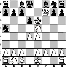 Partie-Notation im PGN-Format [Event "Winter-Spezial"] [Site "www.mySchach.de"] [Date "2009.01.03"] [Round "1"] [White "gunni50"] [Black "stierdame1965"] [ECO "C50"] [WhitemyELO "1348"] [BlackmyELO "994"] [Result "1-0"] [TimeControl "10/1728000"] [WhiteDays "20"] [BlackDays "17"] [MySchachNr "51299"] 1. e4 e5 2. Nf3 Nc6 3. Bc4 Na5 4. Bxf7+ Kxf7 5. Nxe5+ Kf6 6. d4 d6 7. Qf3+ Ke6 8. Qf7# 1-0 Stellungs-Notation im FEN-Format r1bq1bnr/ppp2Qpp/3pk3/n3N3/3PP3/8/PPP1PPPP/RNB1K2R - KQ - 3 8 Geschlagene Figuren Weiss: Geschlagene Figuren Schwarz: Klicken Sie auf eine geschlagene Figur um den gewünschten Zug darzustellen!