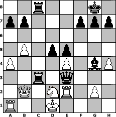 Partie-Notation im PGN-Format [Event "?"] [Site "www.mySchach.de"] [Date "2025.11.15"] [Round "?"] [White "Achimkogge"] [Black "pillepalle"] [ECO "D00"] [WhitemyELO "1236"] [BlackmyELO "2065"] [Result "0-1"] [TimeControl "10/1728000"] [WhiteDays "59"] [BlackDays "43"] [MySchachNr "133947"] 1. d4 d5 2. c3 Nf6 3. Bf4 c5 4. dxc5 Nc6 5. Qa4 Bd7 6. f3 e5 7. Bg5 Bxc5 8. Nd2 Qb6 9. b4 Bf2+ 10. Kd1 Bxg1 11. b5 Ne7 12. e3 Bxe3 13. Bxe3 Qxe3 14. Qb3 O-O 15. a4 Rac8 16. h3 Rxc3 17. Qb2 Nf5 18. Be2 Rfc8 19. h4 Ng3 20. Re1 Nfe4 21. fxe4 Nxe2 22. Rxe2 Bg4 0-1 Stellungs-Notation im FEN-Format 2r3k1/pp3ppp/8/1P1pp3/P3P1bP/2r1q3/1Q1NR1P1/R2K4 - - - 1 23 Geschlagene Figuren Weiss: Geschlagene Figuren Schwarz: Klicken Sie auf eine geschlagene Figur um den gewünschten Zug darzustellen!