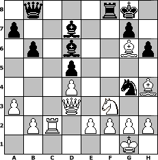 Partie-Notation im PGN-Format [Event "D.A. - Schnell 1"] [Site "www.mySchach.de"] [Date "2008.06.09"] [Round "1"] [White "ujack1961"] [Black "RashimIbenRohal"] [ECO "C05"] [WhitemyELO "1729"] [BlackmyELO "1550"] [Result "0-1"] [TimeControl "10/864000"] [WhiteDays "10"] [BlackDays "09"] [MySchachNr "45500"] 1. e4 e6 2. d4 d5 3. Nd2 Nf6 4. e5 Nfd7 5. Bd3 c5 6. c3 Nc6 7. Ngf3 cxd4 8. cxd4 f6 9. O-O Be7 10. exf6 Nxf6 11. Re1 O-O 12. Nb3 Bd6 13. a3 Qc7 14. Qc2 Bd7 15. Bg5 h6 16. Bh4 Rae8 17. Rac1 Qb8 18. Nc5 Bc8 19. Bg6 Re7 20. Qd3 b6 21. Nxe6 Rxe6 22. Rxe6 Bxe6 23. Rxc6 Bd7 24. Rc2 Ng4 0-1 Stellungs-Notation im FEN-Format 1q3rk1/p2b2p1/1p1b2Bp/3p4/3P2nB/P2Q1N2/1PR1PPPP/6K1 - - - 3 25 Geschlagene Figuren Weiss: Geschlagene Figuren Schwarz: Klicken Sie auf eine geschlagene Figur um den gewünschten Zug darzustellen!