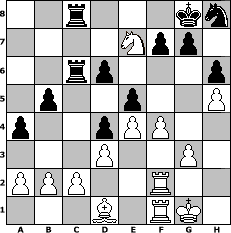 Partie-Notation im PGN-Format [Event "Mittelfeldchampionat"] [Site "www.mySchach.de"] [Date "2005.05.05"] [Round "1"] [White "jean62"] [Black "MaxPayne"] [ECO "A07"] [WhitemyELO "1581"] [BlackmyELO "1430"] [Result "1-0"] [TimeControl "10/1728000"] [WhiteDays "18"] [BlackDays "19"] [MySchachNr "12732"] 1. Nf3 d5 2. g3 Nc6 3. Bg2 e5 4. d3 Bd6 5. Nbd2 Nf6 6. e4 d4 7. Nc4 Be6 8. Nxd6+ cxd6 9. O-O O-O 10. Nh4 Qd7 11. Bg5 Qe7 12. f4 Bg4 13. Bxf6 Bxd1 14. Bxe7 Nxe7 15. Raxd1 Rac8 16. Rf2 Ng6 17. Nf5 Rc6 18. Bh3 b5 19. Bg4 a5 20. Rdf1 Rfc8 21. Bd1 a4 22. h4 h6 23. h5 Nh8 24. Ne7+ 1-0 Stellungs-Notation im FEN-Format 2r3kn/4Npp1/2rp3p/1p2p2P/p2pPP2/3P2P1/PPP2R2/3B1RK1 - - - 2 24 Geschlagene Figuren Weiss: ![]() ![]() ![]() ![]() ![]() ![]() ![]() ![]() ![]() ![]() ![]() ![]() ![]() ![]() ![]() Geschlagene Figuren Schwarz: ![]() ![]() ![]() ![]() ![]() ![]() ![]() ![]() ![]() ![]() ![]() ![]() ![]() ![]() ![]() Klicken Sie auf eine geschlagene Figur um den gewünschten Zug darzustellen!