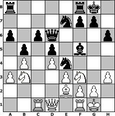 Partie-Notation im PGN-Format [Event "Sommer 2025"] [Site "www.mySchach.de"] [Date "2025.05.13"] [Round "1"] [White "Campino1986"] [Black "Winston"] [ECO "D00"] [WhitemyELO "1543"] [BlackmyELO "1413"] [Result "0-1"] [TimeControl "10/2592000"] [WhiteDays "00"] [BlackDays "60"] [MySchachNr "133354"] 1. d4 d5 2. Bf4 h6 3. c3 a6 4. e3 Nf6 5. Nd2 Bf5 6. Ngf3 e6 7. Be2 Nc6 8. O-O Bd6 9. Bxd6 Qxd6 10. h3 O-O 11. c4 b6 12. cxd5 exd5 13. a3 b5 14. b4 Ne7 15. Nb3 Ne4 16. Rc1 c6 0-1 Stellungs-Notation im FEN-Format r4rk1/4npp1/p1pq3p/1p1p1b2/1P1Pn3/PN2PN1P/4BPP1/2RQ1RK1 - - - 0 17 Geschlagene Figuren Weiss: Geschlagene Figuren Schwarz: Klicken Sie auf eine geschlagene Figur um den gewünschten Zug darzustellen!